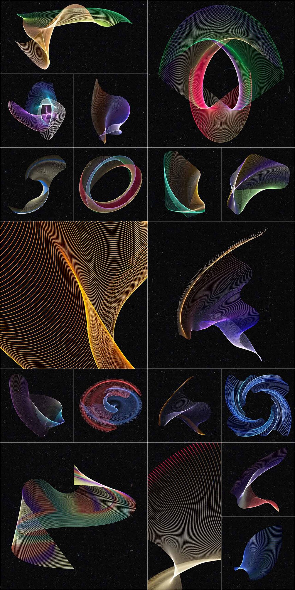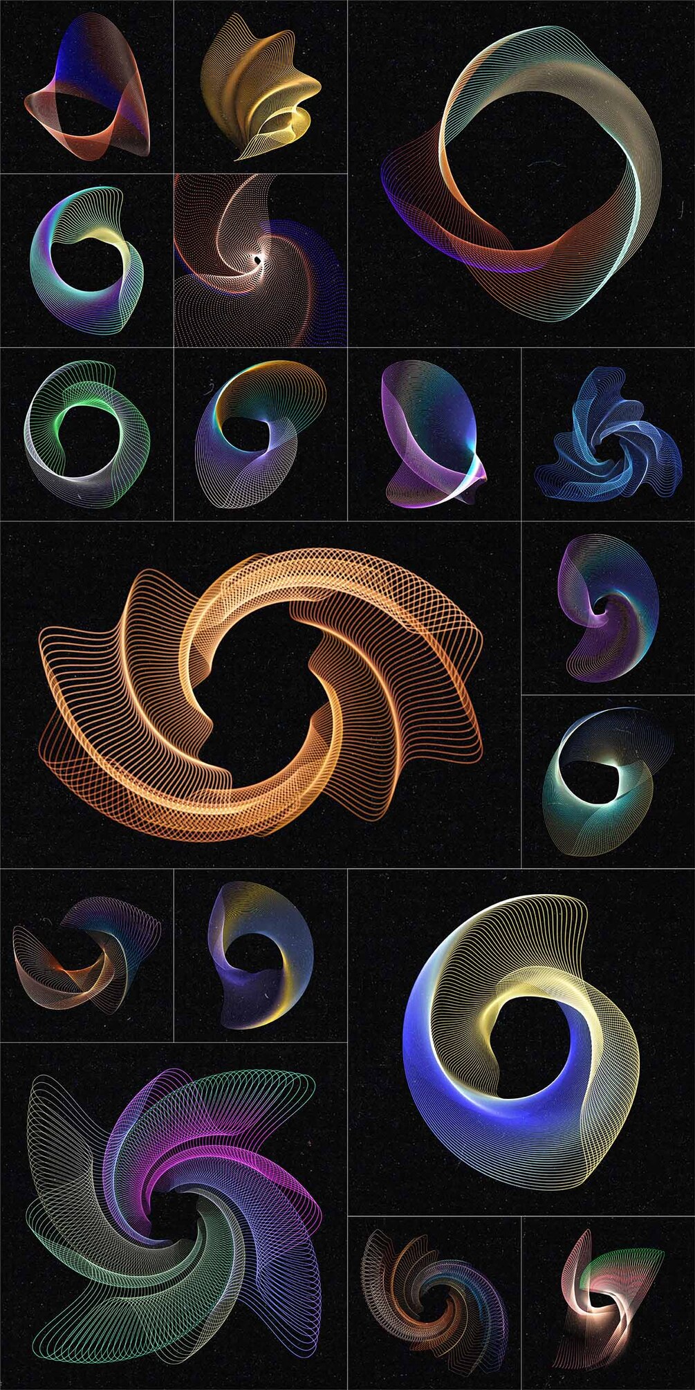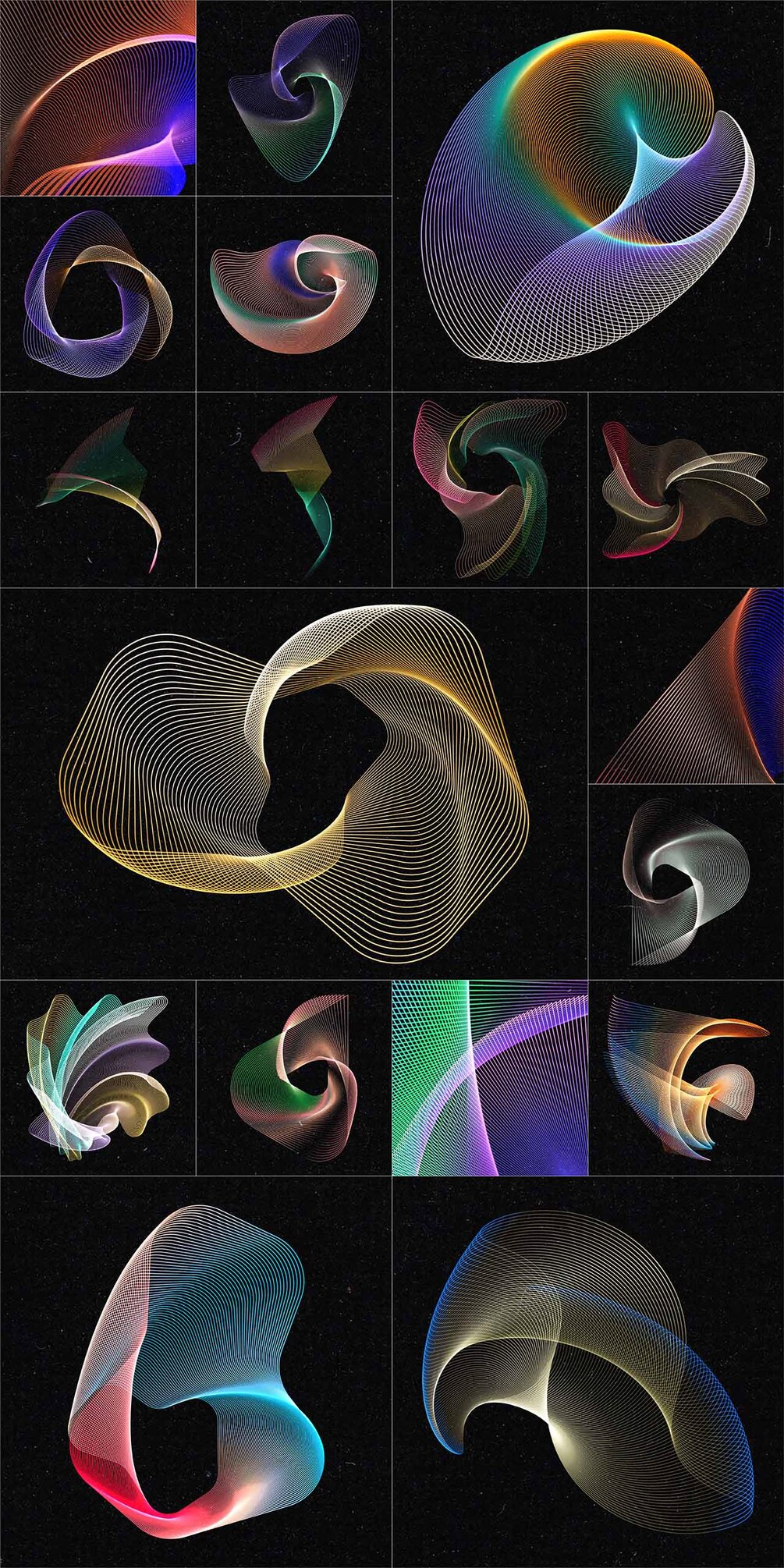 Set of 100 abstract wired design elements with a colourful gradient effect, suitable for your website, app, apparel, packaging, flyers, posters,....as logo or design element for themes like music, technology, science, communication, math, digital art,...