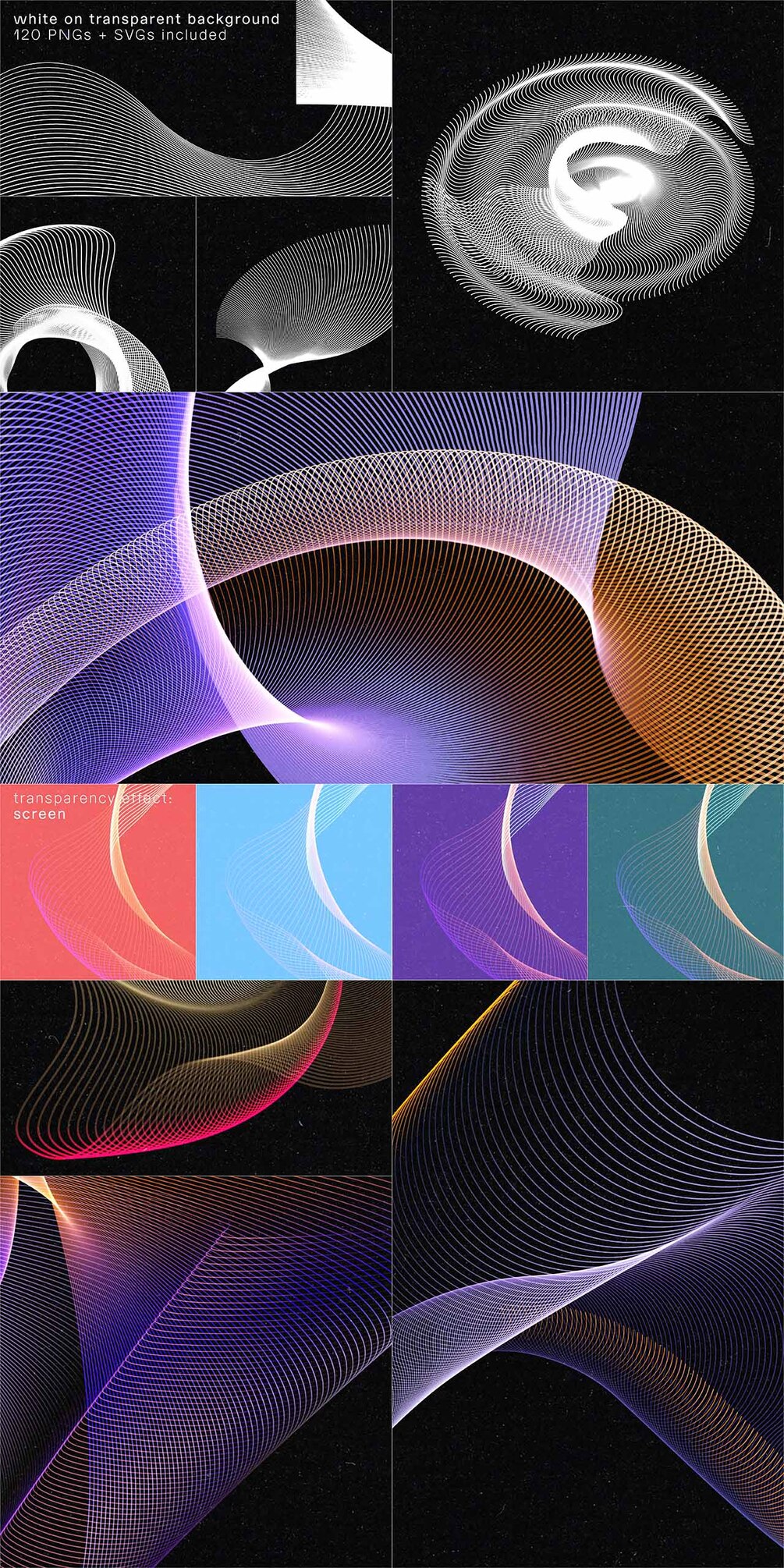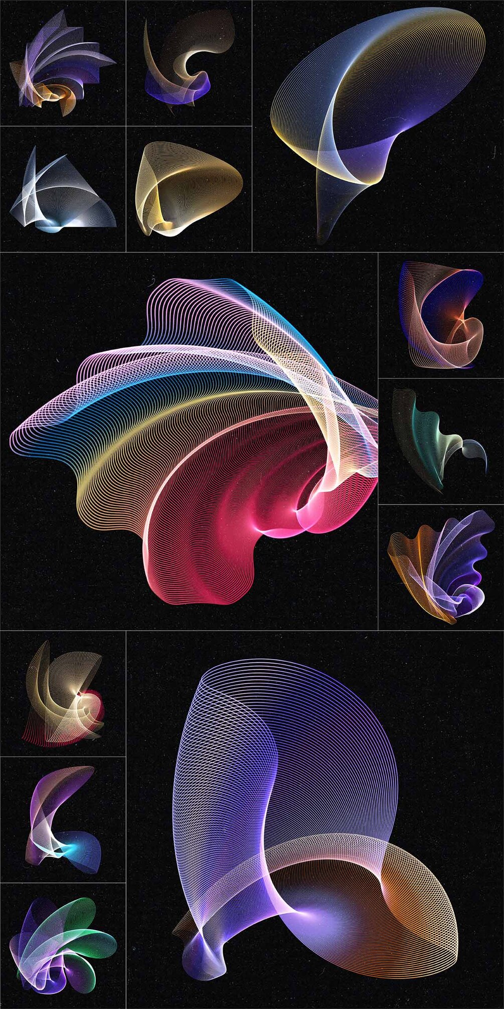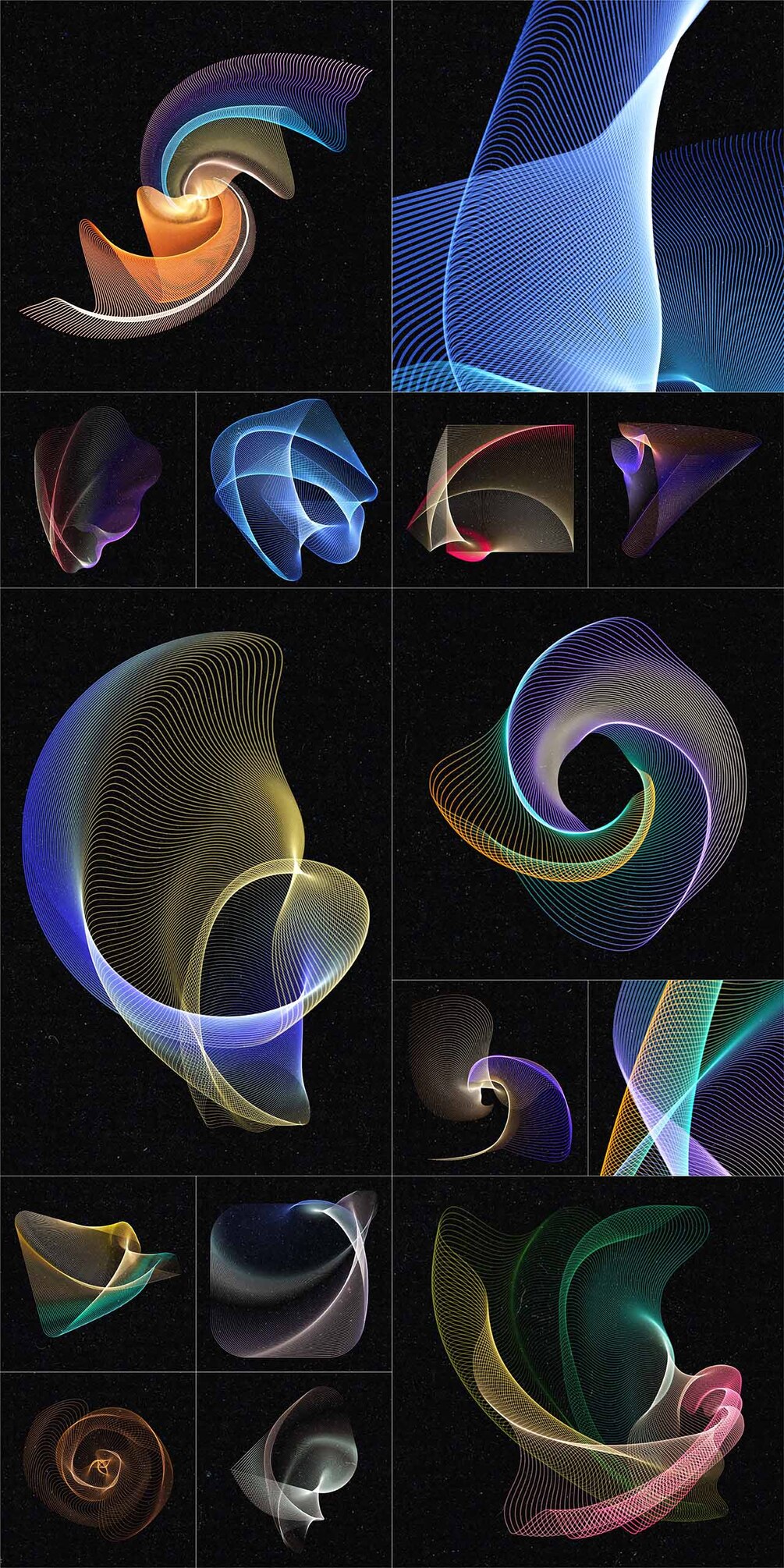 Set of 100 abstract wired design elements with a colourful gradient effect, suitable for your website, app, apparel, packaging, flyers, posters,....as logo or design element for themes like music, technology, science, communication, math, digital art,...