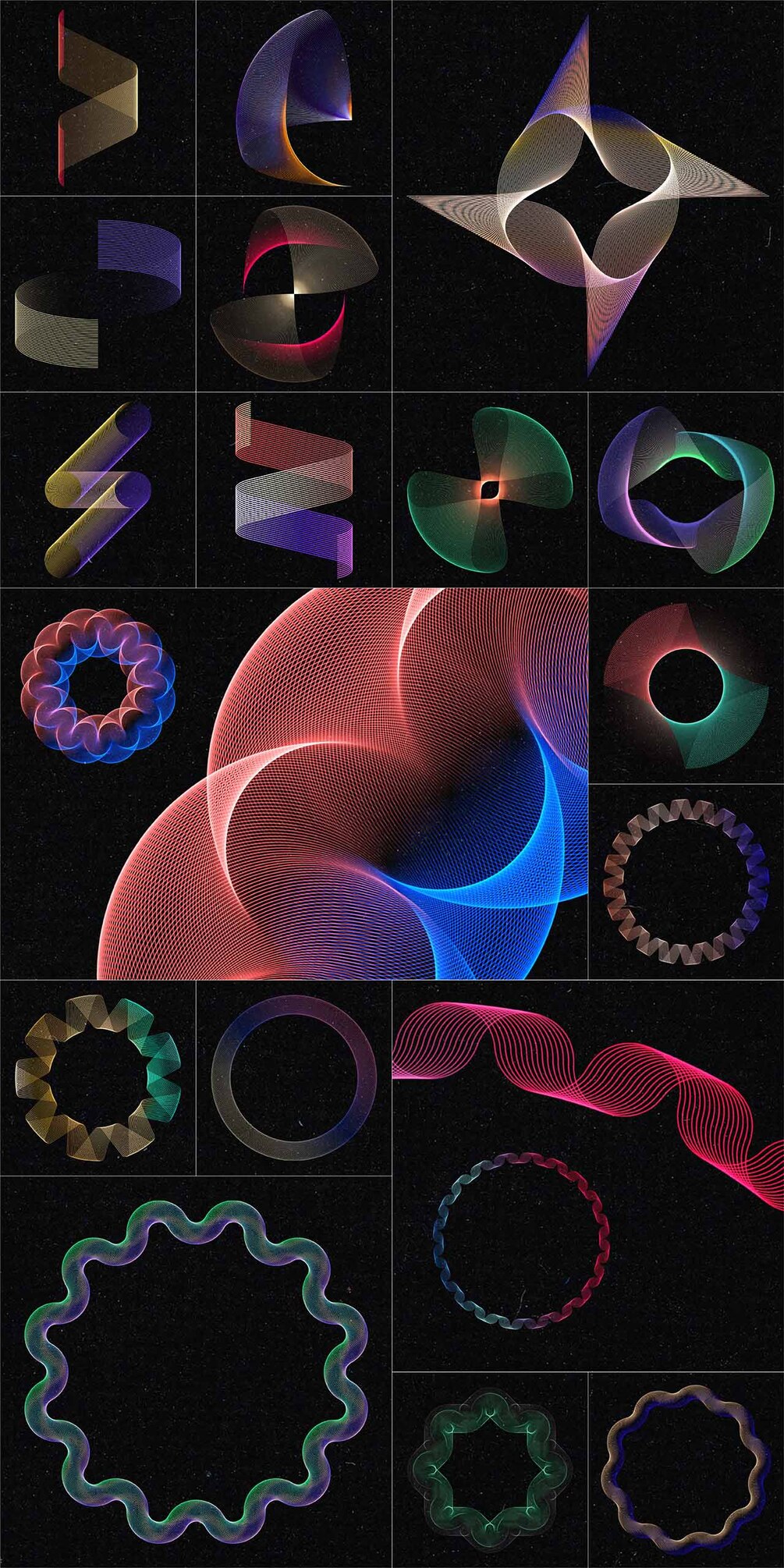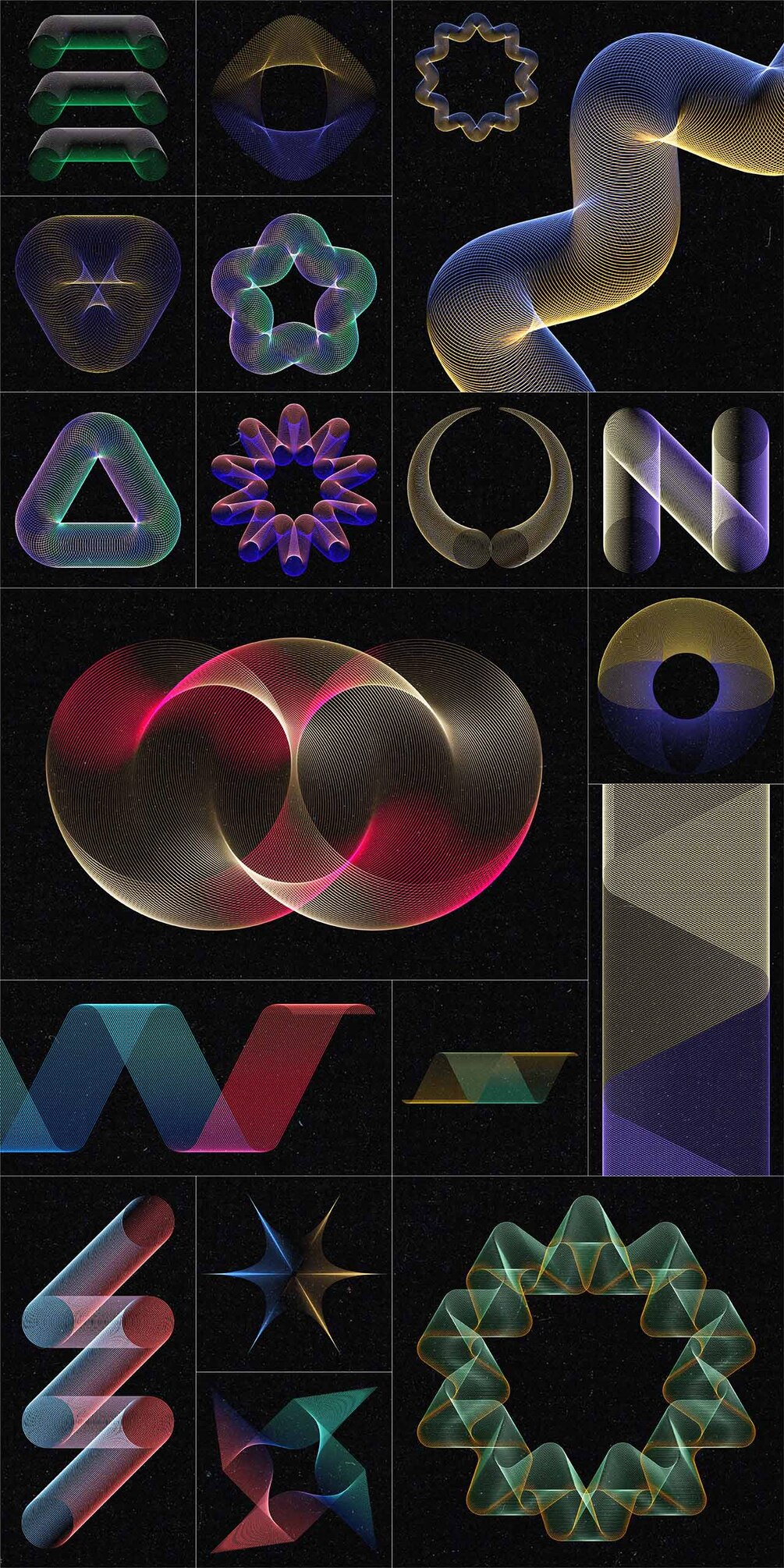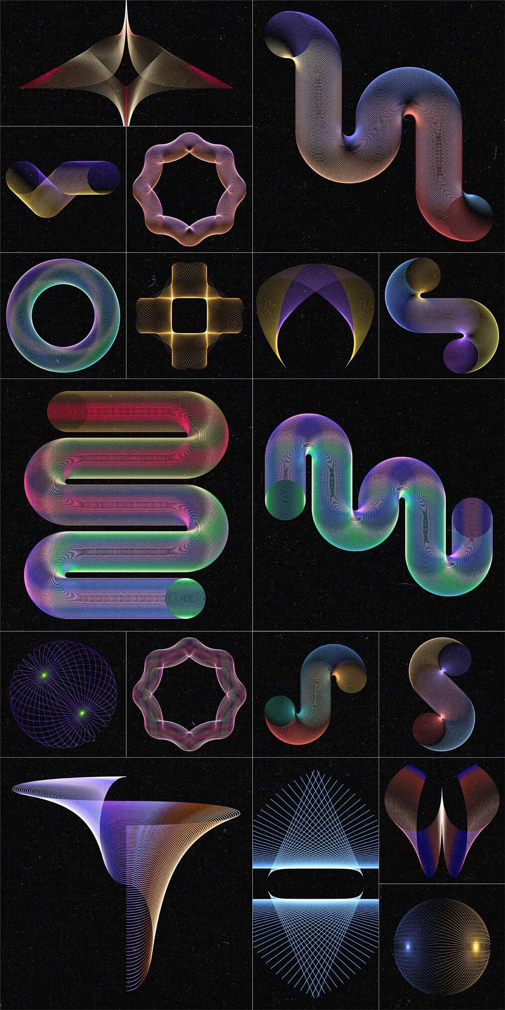Set of 100 abstract wired design elements with a colourful gradient effect, suitable for your website, app, apparel, packaging, flyers, posters,....as logo or design element for themes like music, technology, science, communication, math, digital art,...