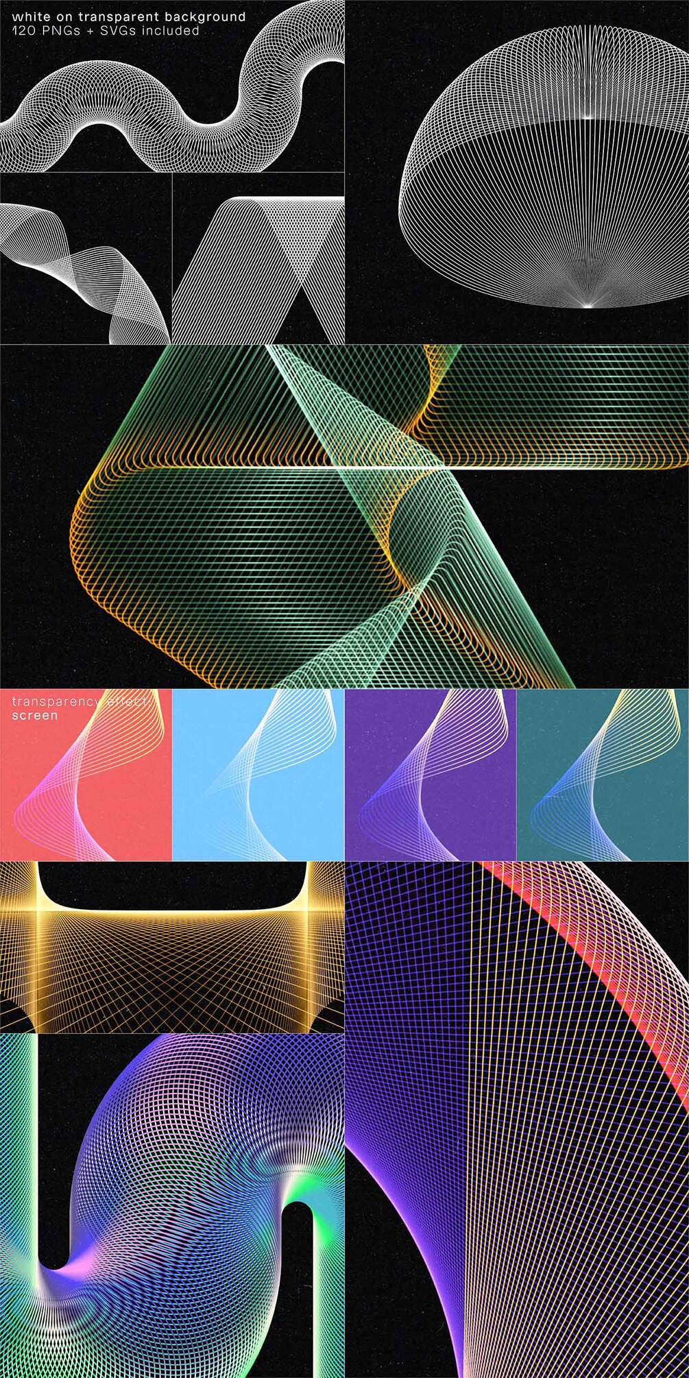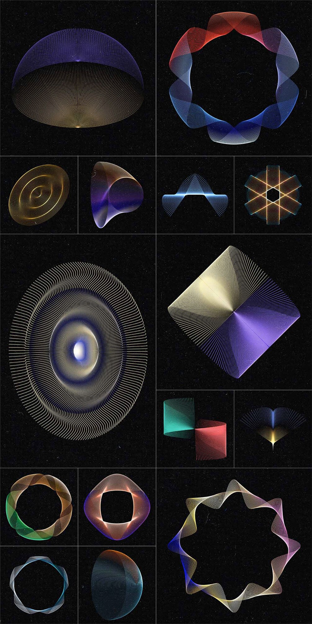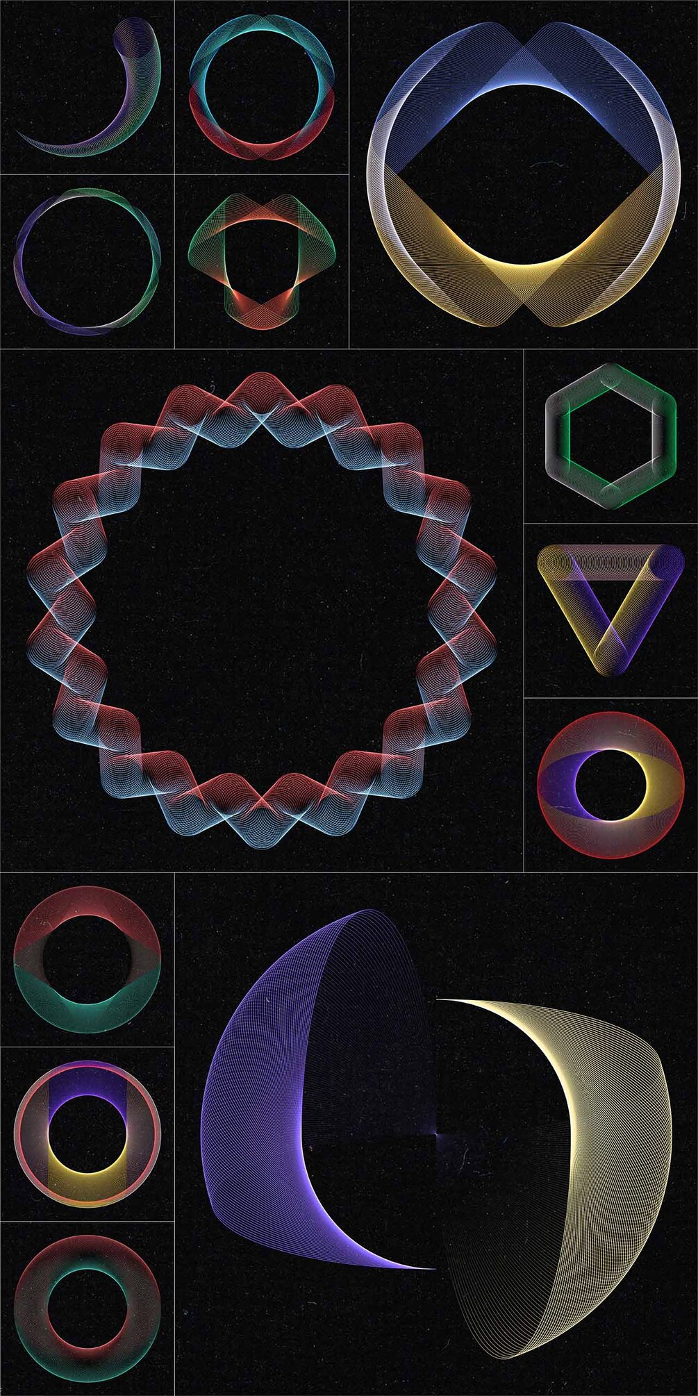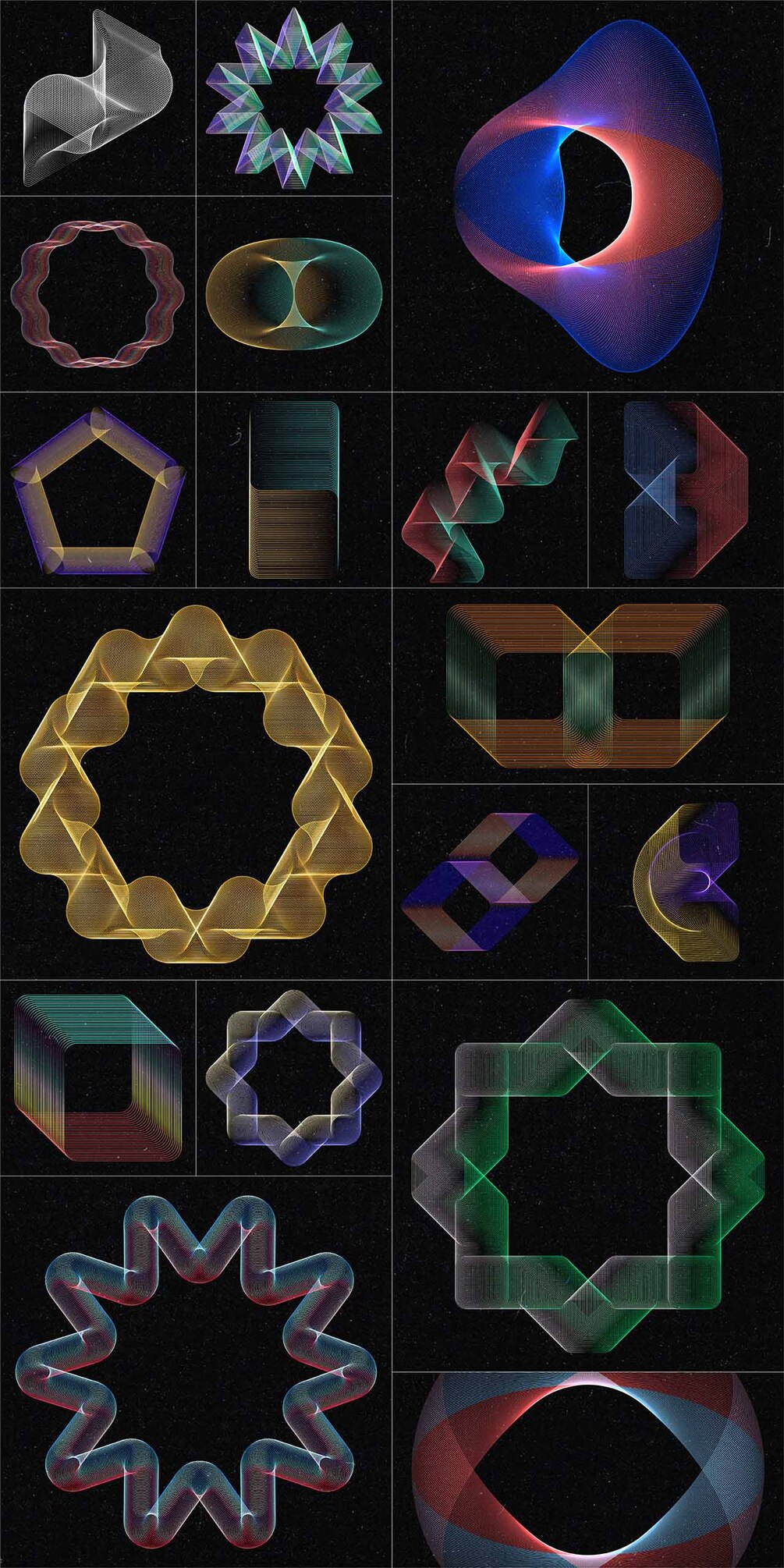 Set of 100 abstract wired design elements with a colourful gradient effect, suitable for your website, app, apparel, packaging, flyers, posters,....as logo or design element for themes like music, technology, science, communication, math, digital art,...